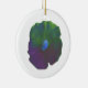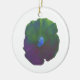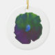 This pretty pendant style ornament features a photograph of a petunia flower that has been manipulated to make the centre of the flower blue. The rest of the flower has shades of purple, green and blue, giving it the appearance of a grungy rainbow flower. There is customisable green text on the back of the ornament so you can personalise it.