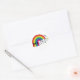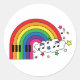 Happy and colourful rainbow transforms into piano keys as it springs forth from a musical fluffy cloud surrounded by music notes and colourful stars.