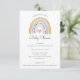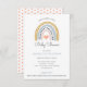 Modern adorable boho pastel rainbow watercolor baby shower invitation simple and sweet, with a small pink heart centre and pinks, blues and mustard hues. Little pink hearts pattern on the back of the invite. A perfect style for a gender neutral invite. Muted soft colours.