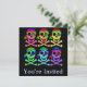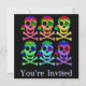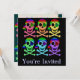 Custom two-sided invitation cards. Front has customisable "You're Invited". Back has invitation information--enter your event title, date, time, location, and additional info or personal message. Pattern of six skull and crossbones in rainbow colours (red orange yellow, with green blue purple below). Each skull has rainbow eyepatch and bandannas. Colourful and simple pirate skull design for Halloween or anytime.