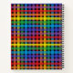 Abstract digital art of lighter coloured rainbow stripes outlined by the thinner solid colour, then crisscrossed to make it appear plaid-like, against a black background.