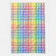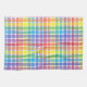 Abstract digital art of lighter coloured rainbow stripes outlined by the thinner solid colour, then crisscrossed to make it appear plaid-like, against a white background.
