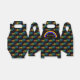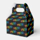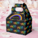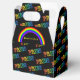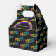 This favour box has black background with the word "PRIDE" in rainbow colours, forming a pattern. On the front side of the box, there is a black panel with a rainbow and an area to ad custom text.