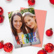 This fun holiday photo card features rainbow typography over a full-bleed single, vertical photo. The greeting on the front says "Happiest Holidays". This design accommodates a single, vertical photo on the front of the card. On the reverse side you will find a festive red and white diagonal stripe pattern which can be removed or customised. You can also add another photo or text to the back by selecting "customise design further".