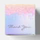 Elegant, classic, glamourous and girly for a Quinceañera, 15th birthday party favours. A trendy rainbow coloured background in pink, purple, rose gold and mint green. With the text: Quinceañera and Thank You written with a modern hand lettered style script. Decorated with faux glitter drips, paint dripping look in purple, pink and rose gold. Personalise and add a name and a date. Grey coloured text.
