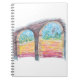 A colourful sketch depicts two stone hacienda arches. The bright hues suggest a sunny atmosphere, and through one arch, a serene landscape with trees is visible.
