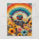 An adorable rainbow robot in a flower meadow with a rainbow in a retro looking mixed media style
