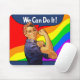 The retro classic WWII era Rosie the riveter "we can do it" image is a traditional icon for strong women. She is shown here against a wavy rainbow coloured background