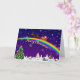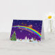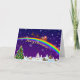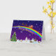 Beautiful snowscape on Christmas night with Christmas trees, houses, a snowman, a church, and Santa Claus flying over a rainbow in the night sky with snowflakes.
