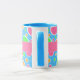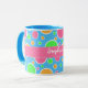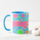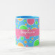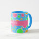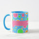 Fun polka dots, in rainbow sherbet colours pink, orange, and green, are on a bubble gum blue background. A pink dotted ribbon is easy to personalise with your name.