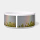 This awesome pet bowl features a beautiful landscape photo of a rainbow over the top of some trees. The photograph was taken immediately after a rainstorm to capture the vivid colours of the rainbow. The surrounding sky is grey with cloud cover.