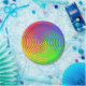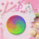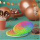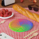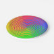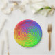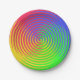 Here is a set of colourful paper plates with an abstract spiral rainbow pattern swirling around a central target in colours of green, blue, yellow, orange and red.