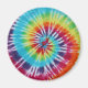 Photo of fabric dyed a bright, colourful rainbow spiral tie dye pattern.