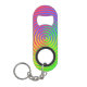 Here is a colourful mini bottle opener with keychain featuring an abstract spiral rainbow pattern swirling around a central target in colours of green, blue, yellow, orange and red. Could be used in the context of LGBT.