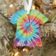 Photo of fabric dyed a bright, colourful rainbow spiral tie dye pattern on a tee shaped acrylic ornament.