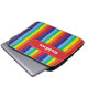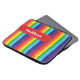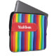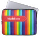 This bright rainbow striped pattern laptop sleeve has a red banner ribbon with white stitching detail across the top. It is personalized with a name or whatever text you want to add.