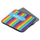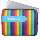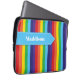 This bright rainbow striped pattern laptop sleeve has a light blue banner ribbon with white stitching detail across the top. It is personalized with a name or whatever text you want to add.