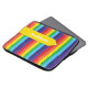 This bright rainbow striped pattern laptop sleeve has a yellow banner ribbon with white stitching detail across the top. It is personalized with a name or whatever text you want to add.