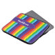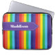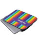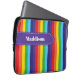This bright rainbow striped pattern laptop sleeve has a purple banner ribbon with white stitching detail across the top. It is personalized with a name or whatever text you want to add.