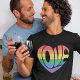 This fun shirt has the text love shaped like a heart and coloured in striped rainbow. It's a great design for gay men and women! It's also a pretty t-shirt for anyone who supports lgbtqia+ rights.