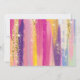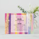 Wedding invitation with an abstract background design. Vibrant stripes in both bold and pastel colours. Pinks, blues, purples and yellow colours combined with faux gold sparkly glitter layered over top.
