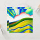 Digital watercolor landscape design in vibrant rainbow colours and textures with a sunrise and protruding sunrays.