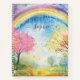 Pretty colourful notebook to write down and keep a note of your happy thoughts. Image is a rainbow and blue sky with clouds over rolling countryside with trees and pretty pink and yellow flowers. Write down your happy thoughts to help your mental health stay positive and give yourself motivation. Great book for kids, young adults or older adults. You can add a name by clicking on the personalise button. Change 'inside paper design' on the right of the image, choose from lined paper, bullet, sketch, graph, recipe, checklist and more.