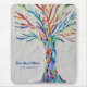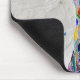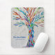 This decorative mouse pad features a print of a rainbow coloured tree on a pale grey background.