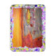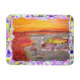 shows fly fisherman tying a fly on with sun setting and rainbow trout chasing a fly from original art also drip painting background !