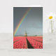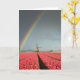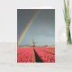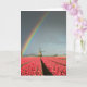 Greeting card with a colourful rainbow in a dark sky over a windmill and a field full of bright red tulips during a spring storm in a landscape near Amsterdam in the Netherlands.