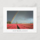 Postcard of a colourful rainbow in a dark sky over a windmill and a field full of bright red tulips during a spring storm in a landscape near Amsterdam in the Netherlands with a white border and the text: 'Netherlands'.
