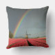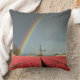 Throw pillow with a colourful rainbow in a dark sky over a windmill and a field full of bright red tulips during a spring storm in a landscape near Amsterdam in the Netherlands.
