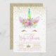 Rainbow unicorn baby shower invitations with adorable watercolor floral unicorn face and rainbow horn on a pretty gold background. This cute unicorn baby shower invitation is easily customised with your event details. You can move the crown as needed for your text, and you can remove the gold background on the back to add the background colour of your choice.