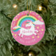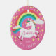 Personalise & Dated Cute unicorn Christmas Ornament featuring rainbow unicorn Framed with yellow stars set on a dark pink background.