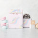 Wrapping paper with pastel rainbow coloured illustrations featuring unicorns and sweets. Check out our store for more wrapping paper suitable for children's birthdays and baby showers.