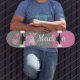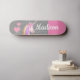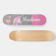 Cool skateboard designed with one end solid pink and the other silver faux glitter with hearts. The pretty white unicorn has pastel rainbow hair and flowers.