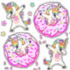Cute and fun dancing Unicorns with rainbow hair doing the dab dance pose. Two unicorns popping out of Pink cartoon Iced Doughnuts with confetti stars and sprinkles.