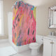 It’s a shower curtain design painted by Granddaughter Gigi. She loves the blue sky, the two suns and her pink version of a rainbow waterfall with black spots.