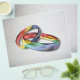 A striking digital image of two interlocked wedding rings made from the swirling colours of a rainbow pride flag. A perfect image to represent marriage equality.