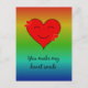 "You make my heart smile" is the quote on this cute and colourful postcard. Romance and happiness together, this is what true love is all about. A large red heart with a smiling-face, and two pairs of smaller red hearts on a rainbow-coloured background.