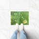 The artwork on this Doormat is an original photograph by ZoeSPEAK of raindrops on a schefflera leaf. The closeup photo shows the veins of the spring green leaf, with random water droplets decorating it with light yellow green, three dimensional highlights. There is a yellow sticker with the word "Welcome" on it. This is optional. The text can be changed, or the entire sticker and text can be removed if you prefer.