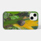 This phone case has a picture of a bright yellow rainforest flower with a snail on a plant next to it.