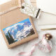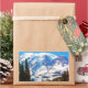 A view of Mount Rainier through a break in a grouping of pine trees.