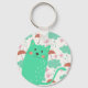 Raining Cats key chain with rain, umbrellas, polka dotted teal clouds, umbrellas, and a teal smiling cat!