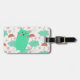 Raining Cats bag tag with rain, umbrellas, polka dotted teal clouds, umbrellas, and a teal smiling cat!