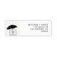 Two love bunnies illustration holding an umbrella under raining hearts on the left side in blush and black with custom return address in modern elegant font on the right