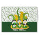 On the front of this cute St. Patrick's Day greeting card are three little gnomes, all dressed in their Irish greens! One holds a shamrock, one holds a gold coin, and one holds a lucky horseshoe. Behind them is a stack of gold bars, and a "rainfall" of green shamrocks. The text at the bottom says "Hoping it rains..." and the sentiment is continued with the inside text. All of the text is easily customised to anything you'd prefer.