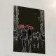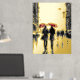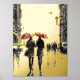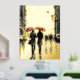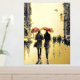 Stylish foil print with artwork of a rainy day in town, with a couple holding red umbrellas. Great foil print for living areas.