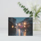 Experience the quiet beauty of Japan's rainy season with this atmospheric postcard. Featuring a stunning depiction of Kyoto’s Gion district under heavy rain, traditional wooden buildings shimmer in reflections, and a lone woman with a red umbrella walks through the peaceful storm. Perfect for seasonal greetings, travel lovers, or collectors of Japanese art and scenery.