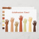 Illustration of a group of diverse hands from different cultures and nationalities raised in the air. Conceptual design showing people coming together and giving each other help and support. Image available on various gifts and products.